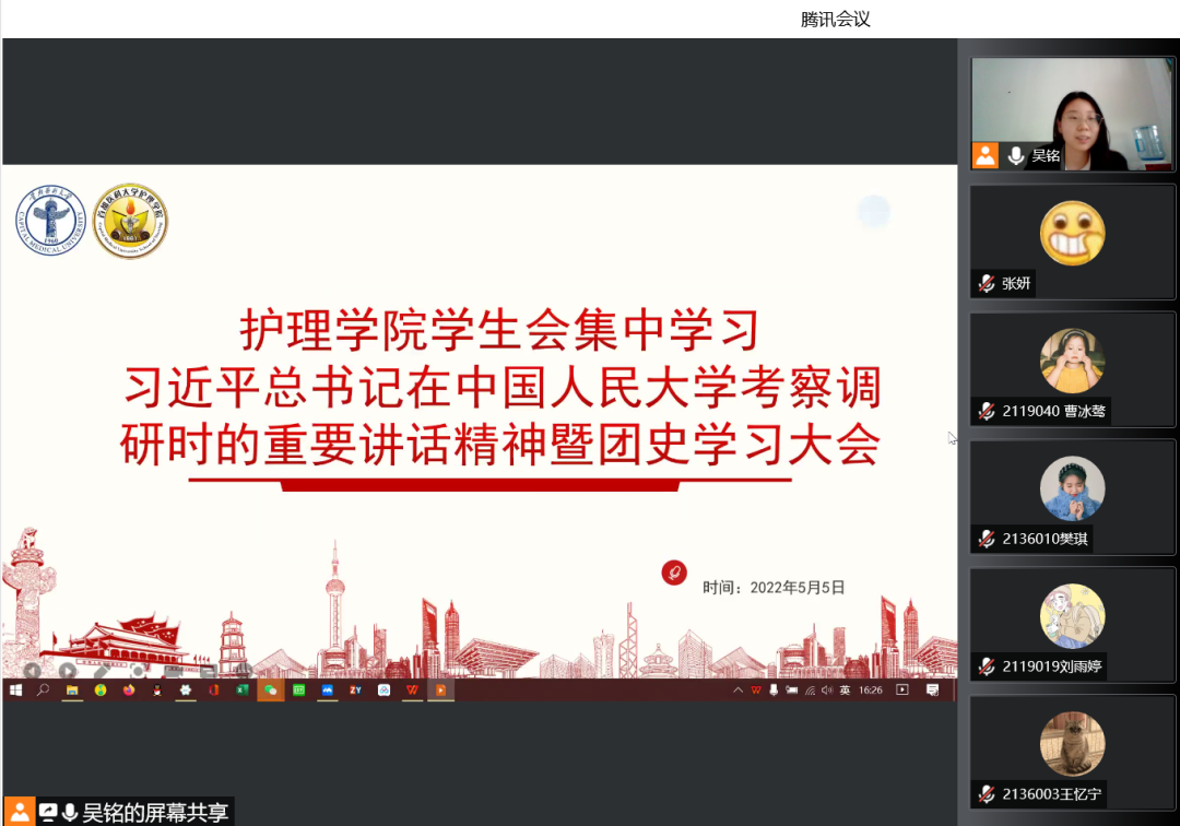 为了深入学习习近平总书记在中国人民大学考察调研时的重要讲话精神,继续深入开展学生会党史团史理论学习,进一步提升院学生会“自我教育、自我管理、自我服务”的意识,喜迎党的二十大,庆祝建团百年,米兰官方站网页版学生会于5月5日召开线上召开习近平总书记在中国人民大学考察时重要讲话精神暨党史团史学习大会,增强理论学习交流,夯实理论学习成果,提升院学生会凝聚力、战斗力。
